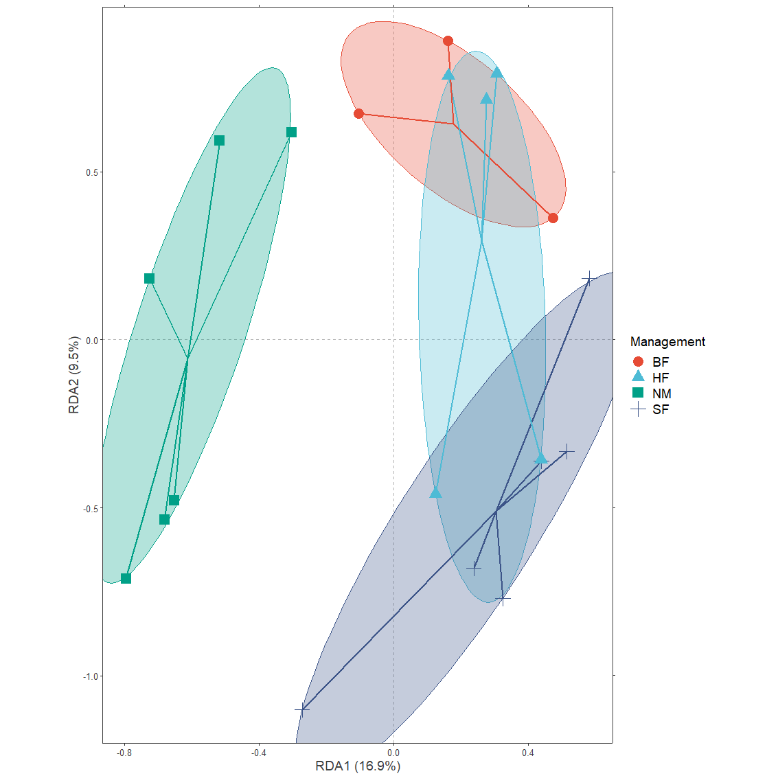 Ordination.model1 <- rda(dune.Hellinger ~ Management,