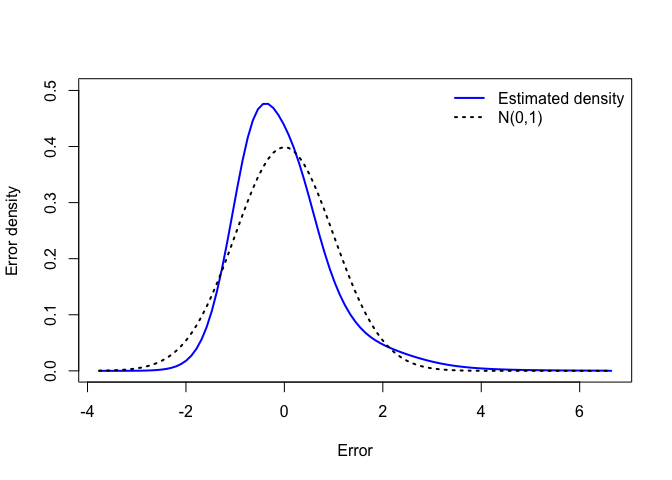 The amount of money available per person in the household tends to decrease with age, see \(f_1^\mu(\mathrm{age})\), between approximately 27 and 37 (most likely due the arrival of children in the family) and to increase after 40 (probably thanks to wage increase with seniority and the departure of children). The log-dispersion significantly increases with Age, see \(f_1^\sigma(\mathrm{age})\), with an acceleration over 30. However, the dominant effect comes from the respondent’s level of education, with a difference of about 1,000 euros (in expected disposable income per person) between a less educated (6 years) and a highly educated (20 years) respondent, see \(f_2^\mu(\mathrm{eduyrs})\). The effect on dispersion is also large, see \(f_2^\sigma(\mathrm{eduyrs})\), with essentially an important contrast between less and highly educated respondents, the latter group showing the largest heterogeneity. The estimated density for the error term can also be seen, with a right-skewed shape clearly distinguishable from the Gaussian one often implicitly assumed when fitting location-scale regression models.