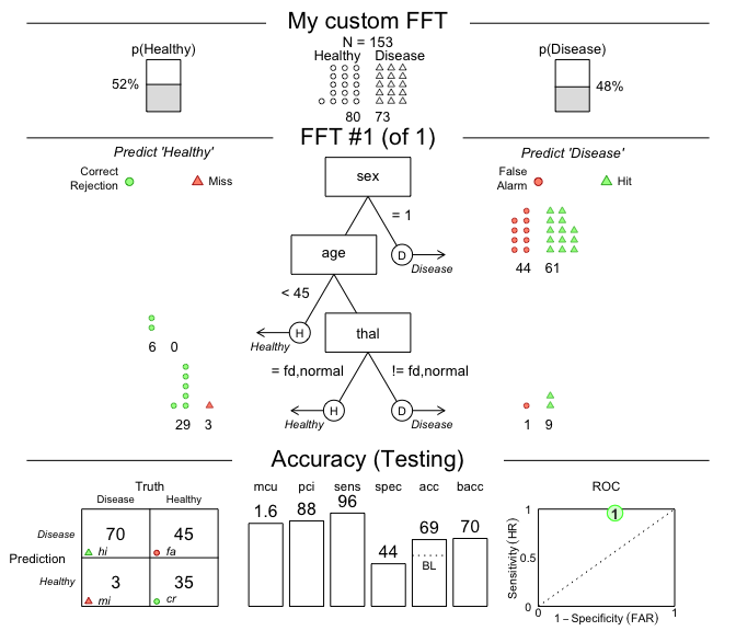 Figure 1: A fast-and-frugal tree (FFT) predicting heart disease for test data and its performance characteristics.