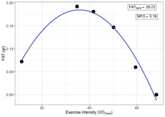The MFO package have been designed to calculate the Maximal Fat Oxidation (MFO), the exercise intensity that elicits MFO (Fatmax) and the SIN model to represent the fat oxidation kinetics. Three variables can be obtained from the SIN model: dilatation (d), symmetry (s) and traslation (t).Additionally, the package allows to calculate MFO and Fatmax of multiple subjects.