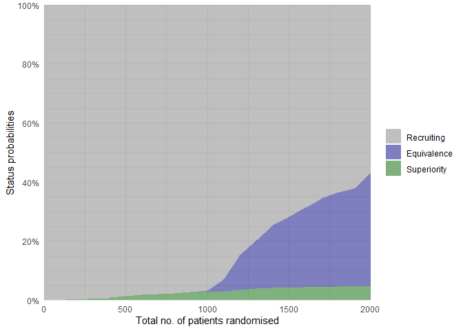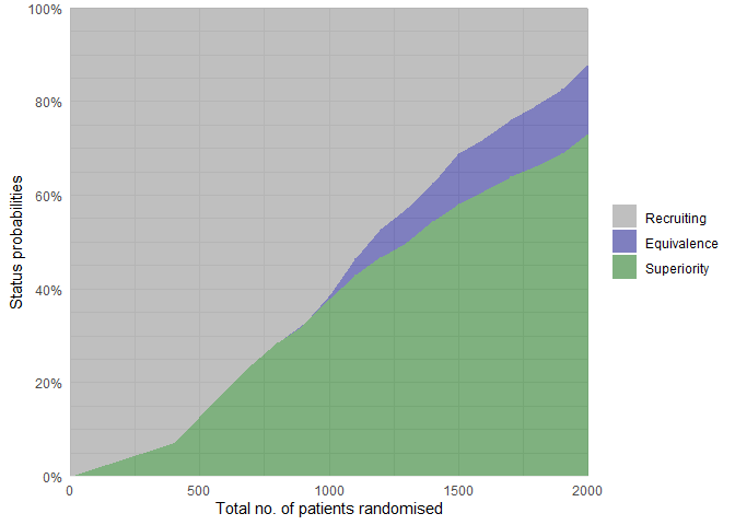 #> Number of patients randomised at each look: 400, 500, 600, 700, 800, 900, 1000, 1100, 1200, 1300, 1400, 1500, 1600, 1700, 1800, 1900, 2000, 2000