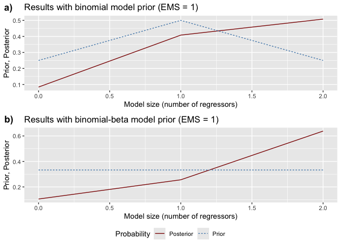 2. model_sizes(): Displays how prior vs. posterior probabilities mass is distributed across different model sizes.