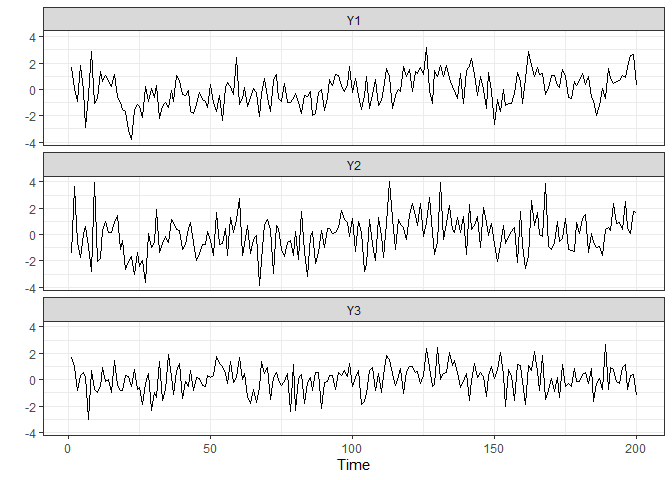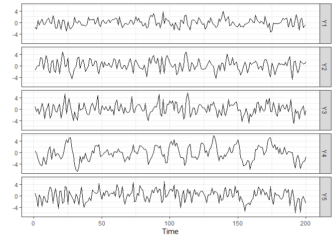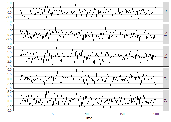 Ysim <- simVAR(periods, k , p, max_abs_eigval = 0.5, seed = 789,