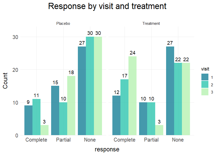 plot_bar(data = clinical_df, x = "response", group = "visit", facet = "treatment",