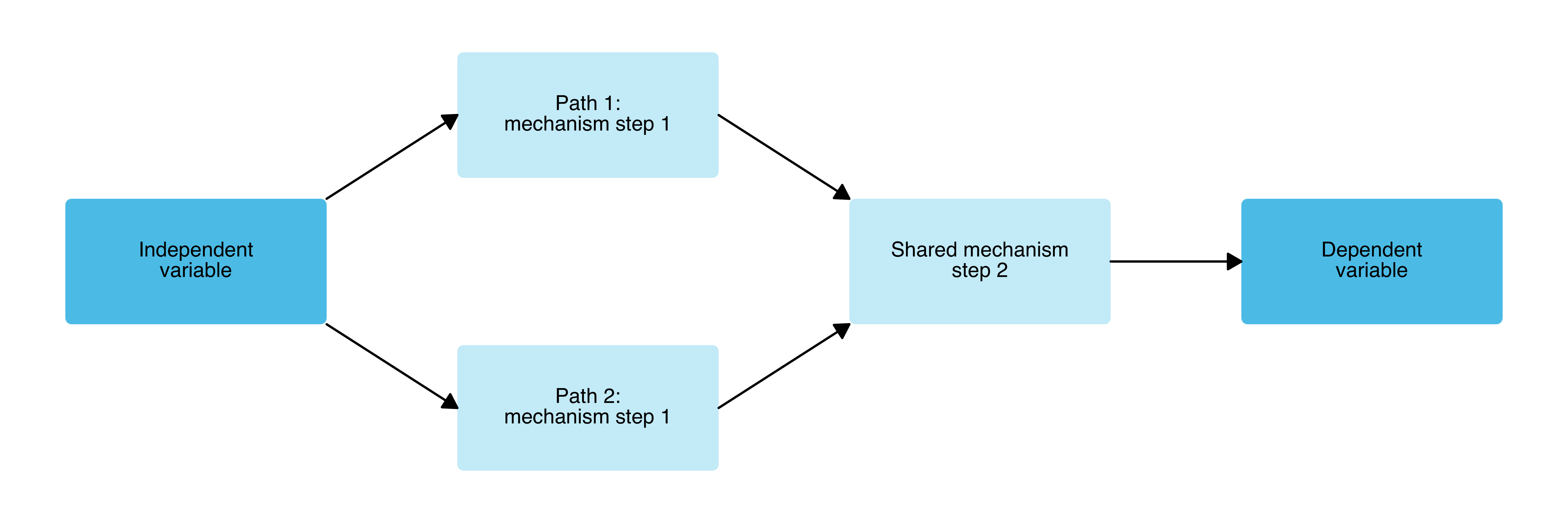 A two-step causal mechanism plot with an independent variable, dependent variable, and two separate causal pathways.