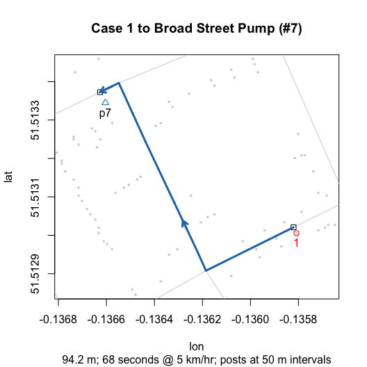 I then wrote functions that compute and visualize walking distances on the map. The value of these functions go beyond the ability to replicate and validate Snow’s efforts. By allowing you to compute hypothetical neighborhoods via selective inclusion or exclusion of pumps or to allow for different measures of proximity (e.g., Euclidean), they also allow you to explore counterfactual scenarios. Ultimately, this can help us to better assess whether we really can use the map to “prove” Snow’s claims.