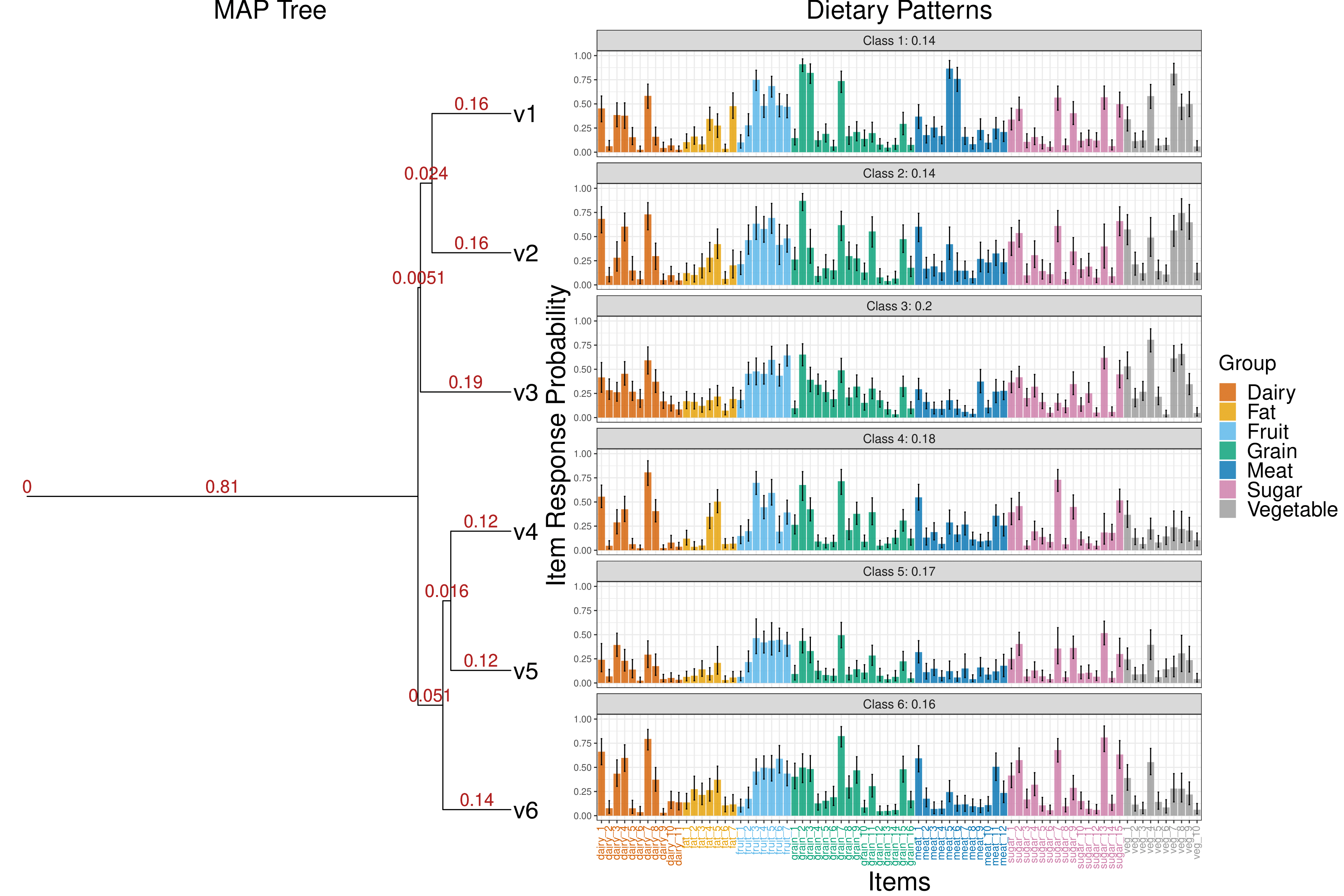 | Bayesian tree-regularized LCM | Li M, Stephenson B, Wu Z (2023). Tree-Regularized Bayesian Latent Class Analysis for Improving Weakly Separated Dietary Pattern Subtyping in Small-Sized Subpopulations. ArXiv:2306.04700. | Link |