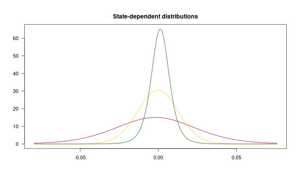 We fit a 3-state HMM with state-dependent t-distributions to the DAX log-returns from 2000 to 2022. The states can be interpreted as proxies for bearish (green below) and bullish markets (red) and an “in-between” market state (yellow).