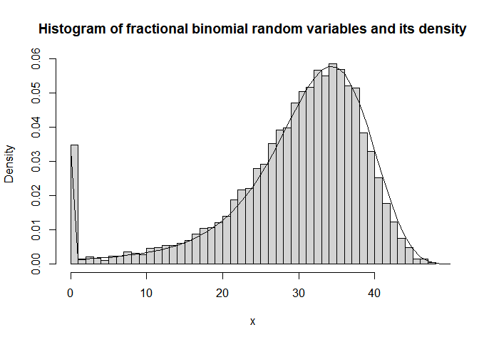 hist(x, breaks=51, probability = TRUE, main="Histogram of fractional binomial random variables and its density")
