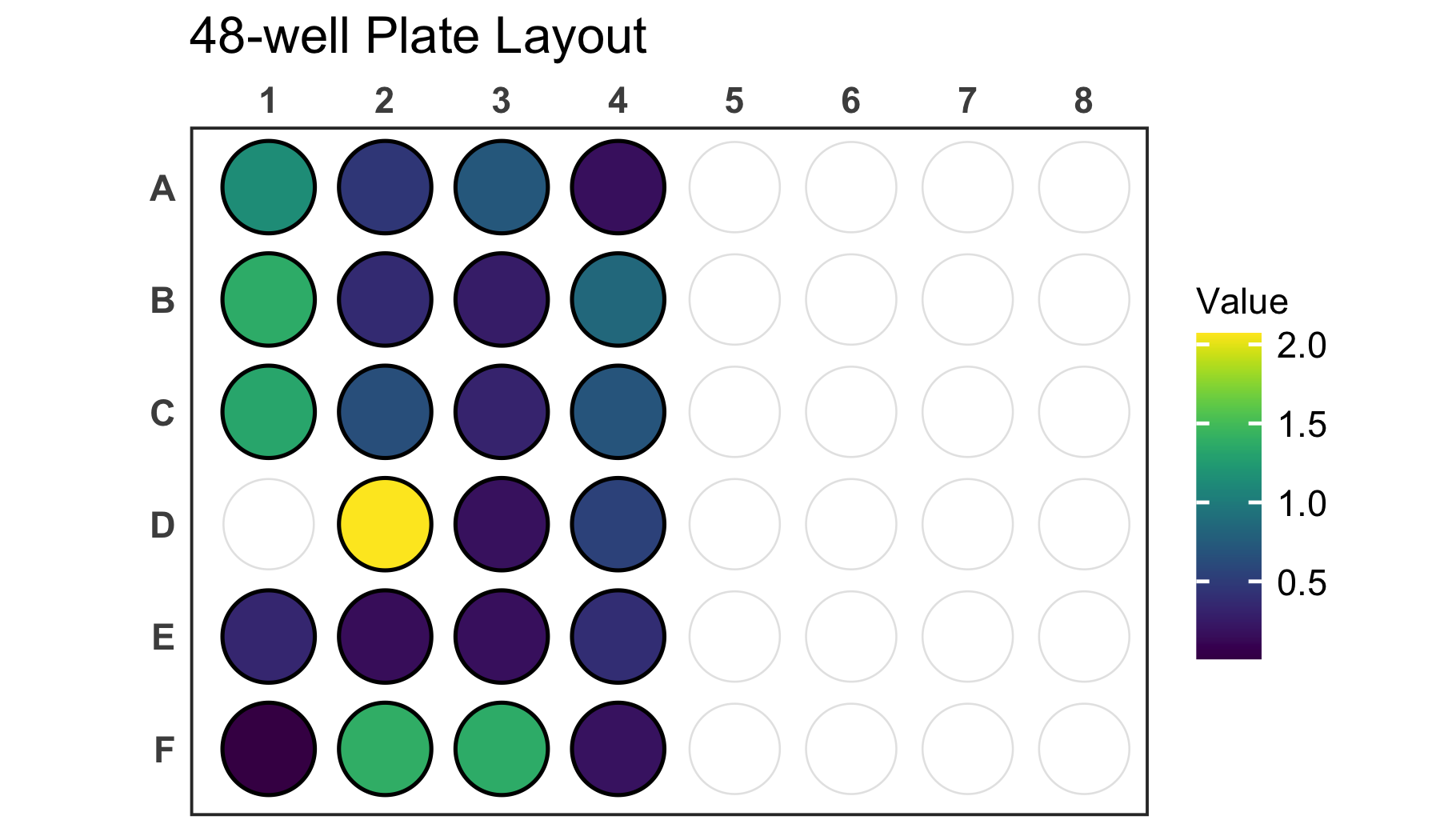 If you have a dataset that does not contain a value for each well, empty wells will be uncoloured. Empty wells can either contain NA as their value argument or they can be completely omitted from the input data frame.