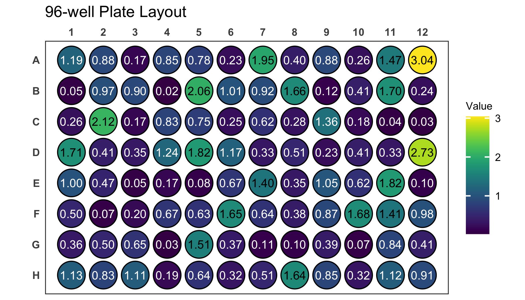 It is also possible to label each well in the plate with a corresponding label. For the plate above it would be interesting to display the exact value on each of the wells in addition to the colouring. For that we use the label argument which takes the name of the column containing the label as an input. In this example case this column is the same that is also provided to the value argument.