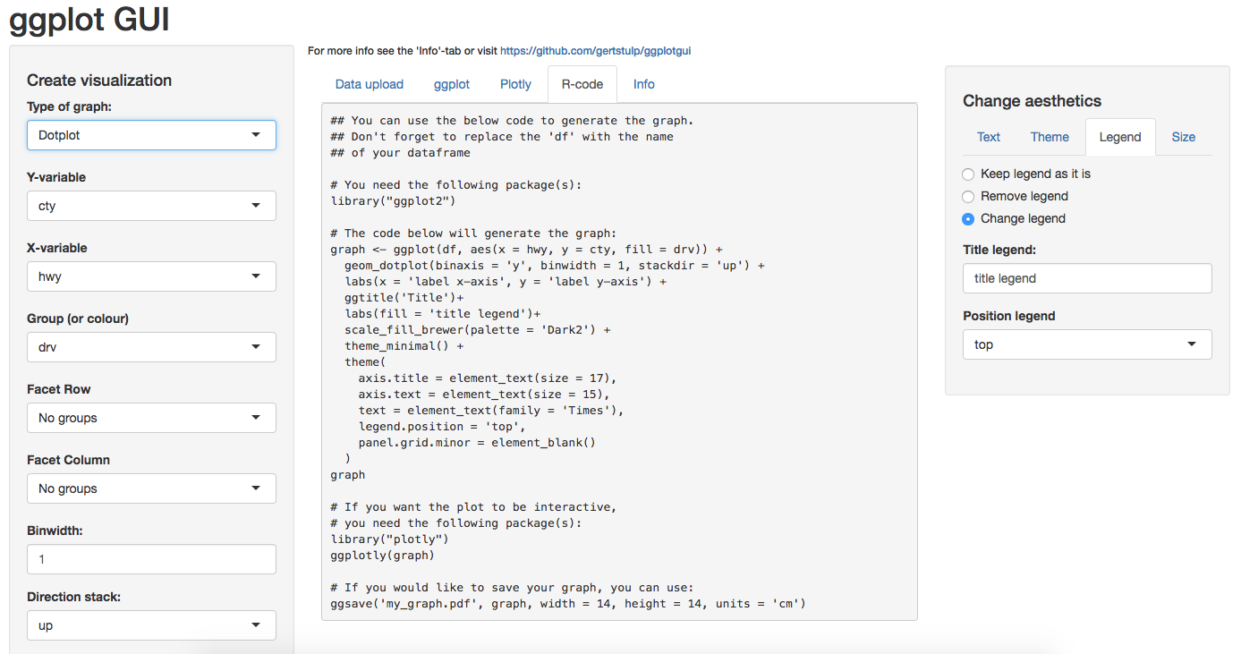 R is amazing, but daunting for many. The programming style of R, compared to the point-and-click style of typical software, is a hurdle for many. Perhaps particularly so for those in the social sciences, whose statistical needs are often met by other software packages. Yet such packages are often very limited in terms of their options to visualize the data at hand. I believe that the amazing visualization-capabilities of R might be one way to get more people to use it. To lower the barrier to start using R, this package allows users to visualize their data using an online graphical user interface (GUI) that makes use of R’s visualization package ggplot. There are two ways of using this functionality: 1) online, where users can upload their data and visualize it without needing R, by visiting this link: https://site.shinyserver.dck.gmw.rug.nl/ggplotgui/; 2) from within the R-environment (by using the ggplot_shiny() function). Importantly, the R-code will also be provided such that the user can recreate the graphs within the R-environment. The main aim (or hope) is to get more people using R and its wonderful (graphing) capabilities.