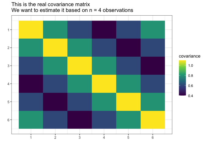 Suppose we do not know the actual covariance matrix \(\Sigma\) and we want to estimate it. We cannot use the standard MLE because it does not exists (\(4 < 6\), \(n < p\)).