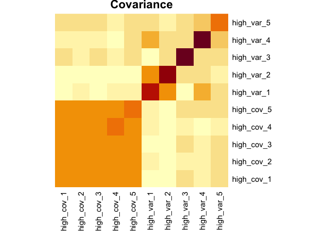 sim_covar(n_vars = 5, cov = 0.1, var = 2, name = "high_var") Explore covariance structure visually. The diagonal is variance.