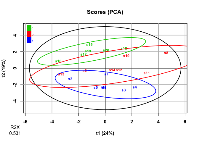 #> # discr2_3 <dbl>, discr2_4 <dbl>, discr2_5 <dbl>pca <- opls(select(df2, -factor), fig.pdfC = "none", info.txtC = "none")