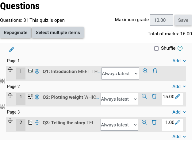 This is useful if your quiz contains several thematically similar questions, or if you want to randomize a specific question of group of questions.
