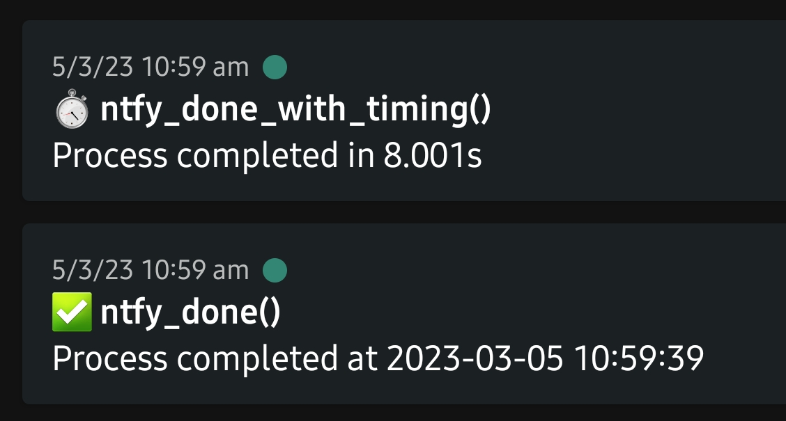 We can use this fact to time the running of a process if the last function (above, h()) is system.time(). The ntfy_done_with_timing() function does exactly this