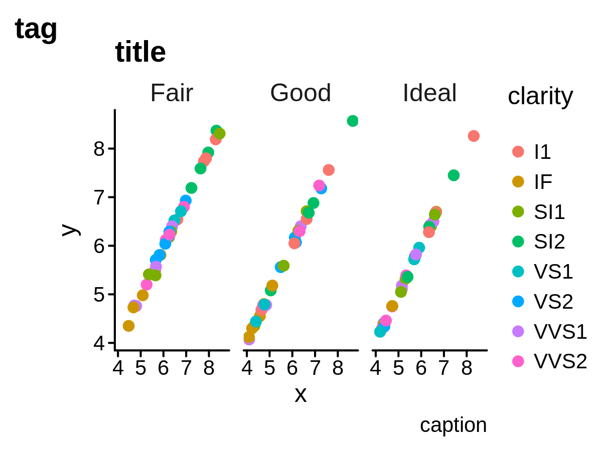 #> # … with 90 more rows# bioletter_colorsggplot(mini_diamond, aes(x = x, y = y, color = clarity)) +