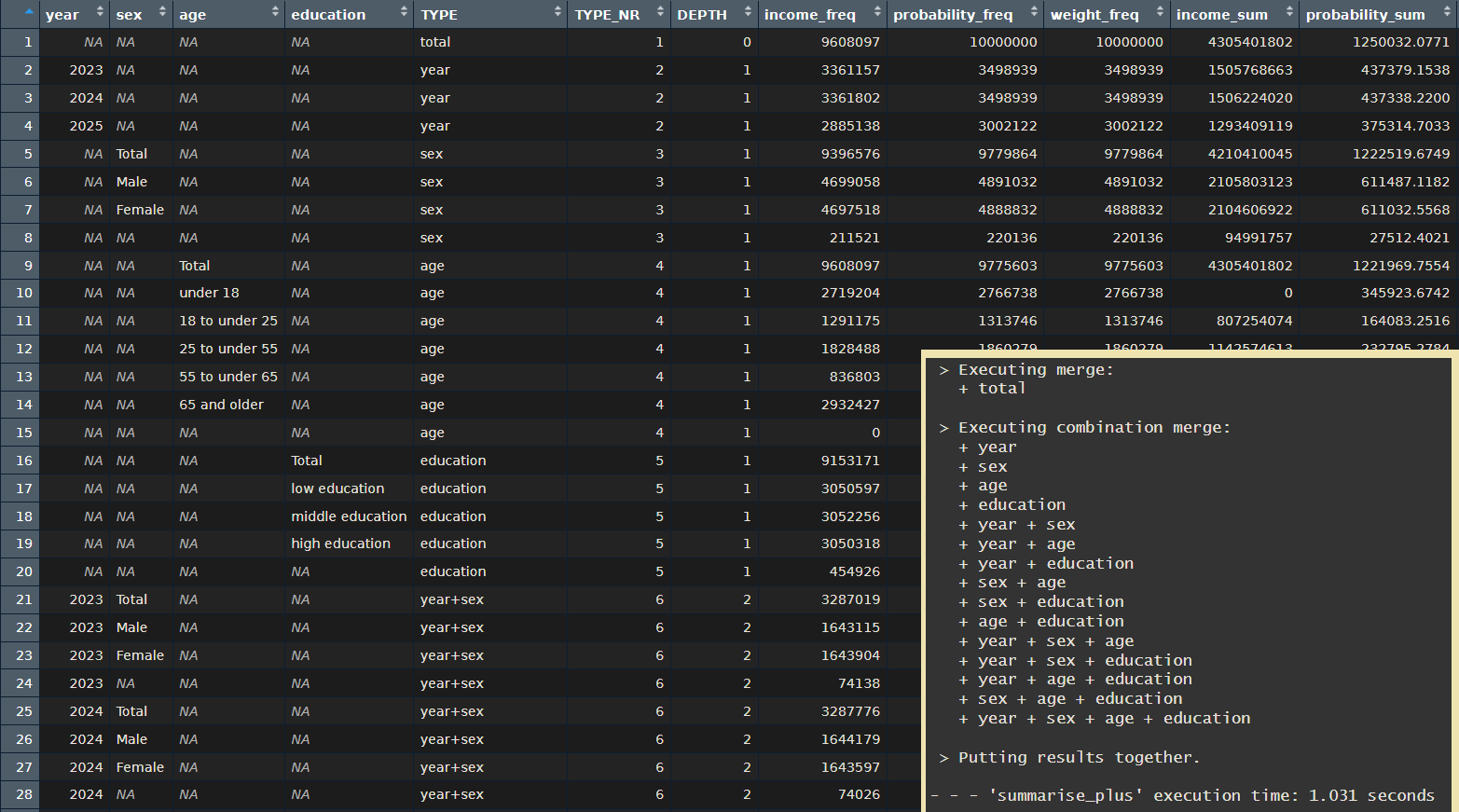summarise_plus(class = c(year, sex, age, education),