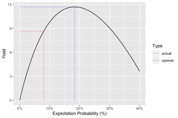 ypr is an R package that implements equilibrium-based yield per recruit methods. Yield per recruit methods can used to estimate the optimal yield (Walters and Martell 2004) of a fish population with one or more ecotypes. The yield can be based on the number of fish caught (or harvested) or biomass for all fish or just large (trophy) individuals.
